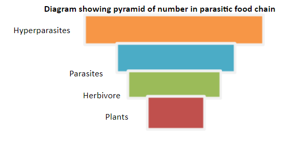 The pyramid of number shows the number of living beings at each trophic level. In the parasitic food chain, the pyramid of number is inverted. In this, the essential makers (plants) are least in number followed by essential customers (herbivores) trailed by optional shoppers (parasites). In this, the greatest number of people are available at the top trophic level (hyperparasites). Hence, the right answer is ‘Inverted'