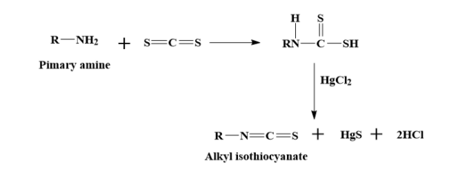 iii) Primary amines when treated with carbon disulphide, followed by heating with excess $HgC{{l}_{2}}$ gives isothiocyanates, that are responsible for the pungent smell that is similar to that of mustard oil.