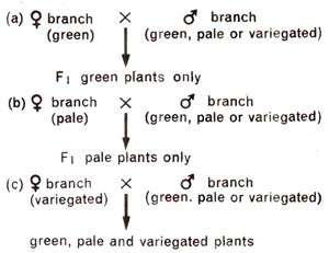 In a four o'clock plant (Mirabilis jalapa), three sorts of branches as for the event of plastids might be found. These are (I) green, (ii) light green, or (iii) variegated. In such cases, the aggregate of descendants will have an endless supply of branches upon which blossoms are pollinated. at the point when variegated branches are utilized as a female source, both green and pale plastids are available in cells of the female parent. Hence, female gametes may convey either green or pale plastids or both.