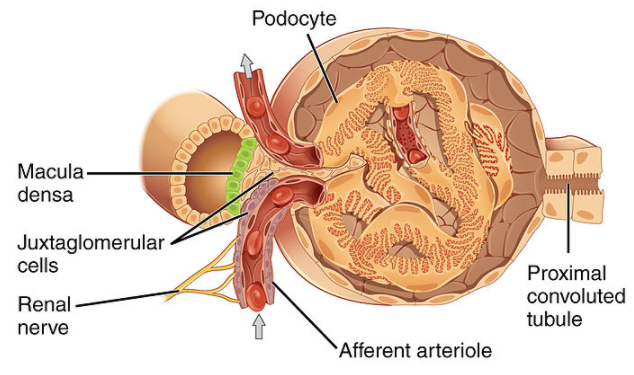 > Juxtaglomerular cells - These are also called granular cells and these cells secrete renin. These cells are present in the tunica media of the afferent arterioles, this cell stimulates beta-adrenergic receptors, they decrease the renal perfusion pressure, which decreases the NaCl concentration and this all finally decreases glomerular filtration rate.