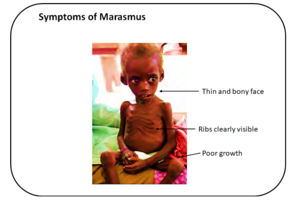 Note: Marasmus is distinguishable from kwashiorkor. Kwashiorkor is a protein deficiency that involves adequate energy intake however marasmus includes inadequate energy intake in all forms, including protein. The symptoms of kwashiorkor include edema, bulging abdomen, swollen appearance, and inability to grow and gain appearance.