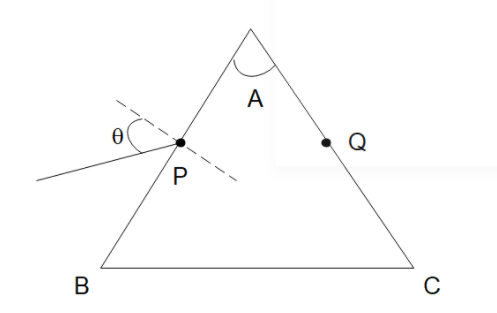 Let the angle of incidence on the surface AB be $\theta $. Then using Snell’s law on the first surface, the incident medium will be air so its refractive index will be 1.