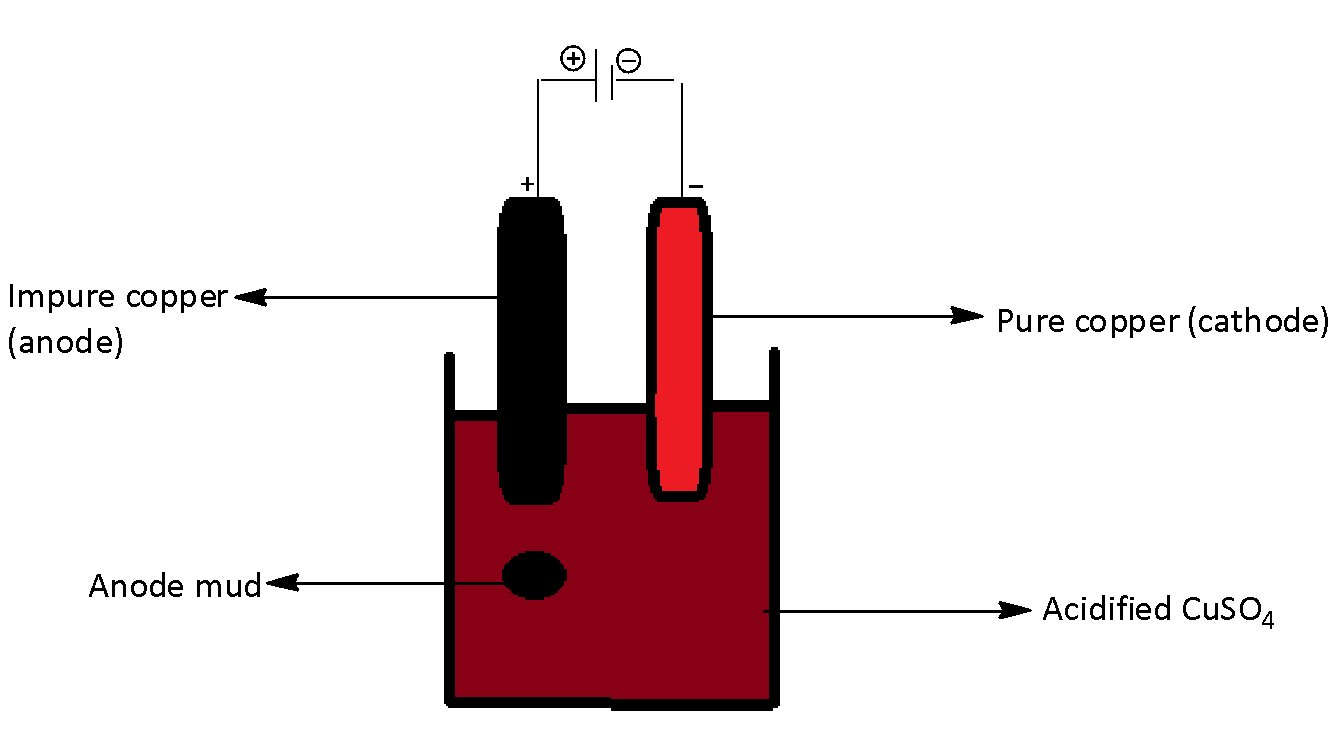 Hint: We can say that in the process of electrorefining, impurities such as iron, zinc and nickel get dissolved in the solution whereas gold, silver and platinum are deposited as anode mud under the anode and 100% copper is derived from crude copper.