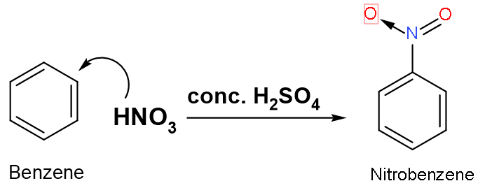 Nitration of benzene is a type of electrophilic substitution reaction. A substitution reaction in which aromatic compounds hydrogen of benzene nucleus is replaced with a nitro group of concentrated nitric acid in presence of concentrated sulphuric acid which yields nitro derivatives is known as ‘nitration’. The ratio of concentrated nitric acid and concentrated sulphuric acid is (1:2) in the mixture as reagents of the reaction.
