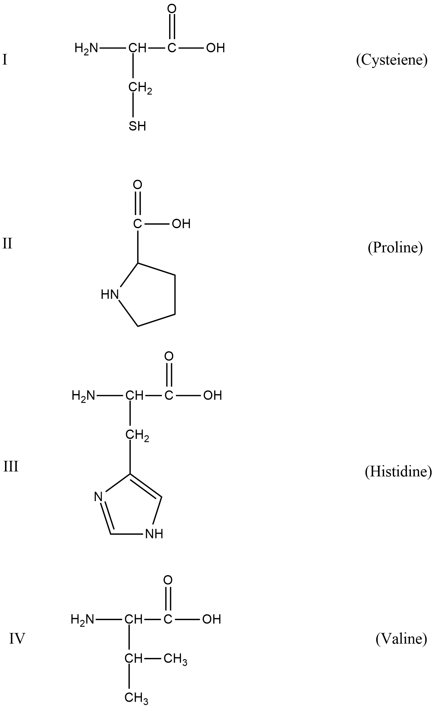 - The given amino acids in the question are Cysteine, proline, histidine and valine.
