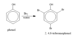 Phenol treated with bromine water produces 2, 4, 6-tribromophenol. The reaction is as follows: