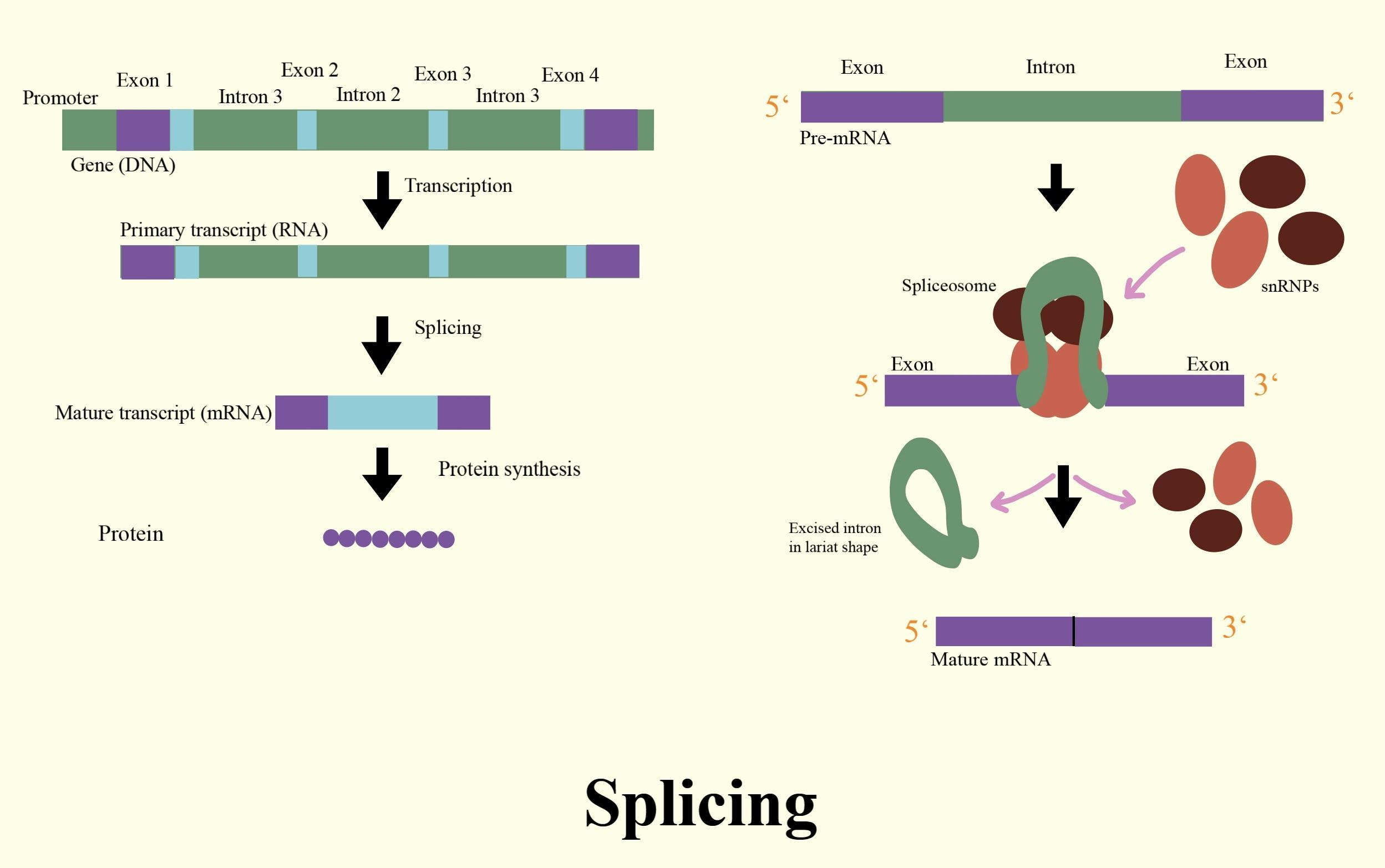 - Splicing: deleting introns from the primary transcript and ligating exons to create a continuous sequence that determines a functional polypeptide.