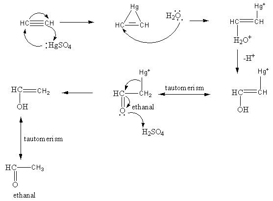 First the mercury attacks on the reactant ethyne and forms a cyclic structure. Then water attacks on this cyclic structure forming a mercury cation. Then by the removal of hydride alcohol forms.