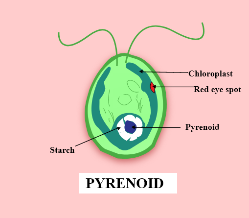 Pyrenoids are usually associated with the operations of the carbon- concentrating mechanism (CCM) . They function as the centres of carbon dioxide (${C}{O}_{2}$) fixation. They do this by generating and maintaining a ${C}{O}_{2}$ rich environment. They have a central, viscous, granular core that is proteinaceous in nature and they are surrounded by tightly packed minute plates of starch. This central mass of protein is also known as pyreno-crystal.