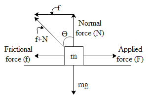 $\text{tan }\!\!\theta\!\!\text{ }=\dfrac{\text{f}}{\text{N}}$ Since, $\text{f =}{{\text{ }\!\!\mu\!\!\text{ }}_{\text{S}}}\text{mg}$ and N= mg,