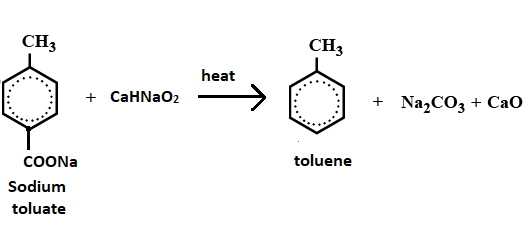 $\text{sodium toluate + NaOH + Cao}\xrightarrow{heat}\text{ Toluene + N}{{\text{a}}_{2}}C{{O}_{3}}$