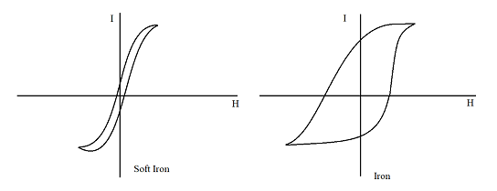 Now, clearly from the diagram the area of the hysteresis loop is larger for iron than for soft iron.