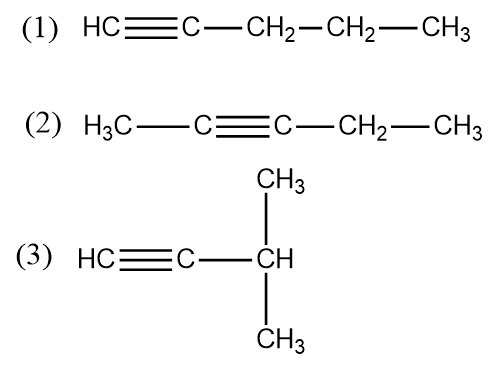 The first structure made is known as Pent-1-yne. The second structure is known as Pent-2-yne.the third structure which is made is branched so we will see the longest chain of carbon atoms and then name it so the name will be 3 methyl but-1-yne. So the structure that can be made by pentyne is 3. So the correct option for this question is option ’b’. in the first structure we have 12 sigma bonds and two pi bonds. In structure two of pent-2-yne we have again 12 sigma bonds and two pi bonds. In structure three of 3 methyl but-1-yne we have again 12 sigma bonds and two pi bonds.