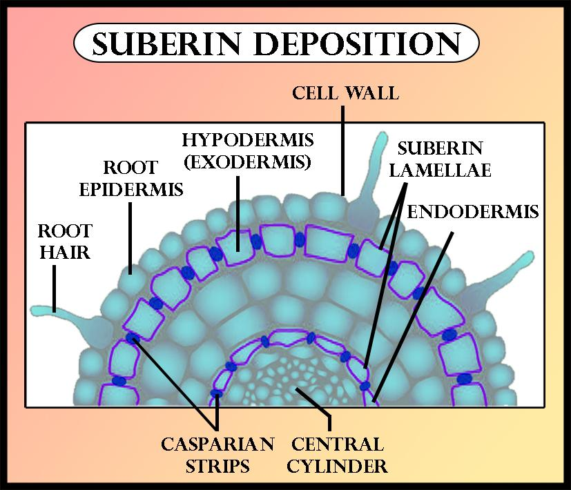 The suberin is a wax-like fatty substance, which occurs in cork cell walls and in or between other cells. On alkaline hydrolysis, it yields chiefly suberic acid. It is highly hydrophobic in nature and its main function is to prevent water from penetrating the tissue. The suberin is collected in the radial and transverse cell walls of the endodermal cells in the roots. This structure is called the Casparian strip or Casparian band. The suberin is present in the phellem layer of the periderm (or cork). This is the outermost layer of the bark. In suberin, the cells which are present in this layer are dead and abundant, which prevents water loss from the tissues below. Suberin is a primary constituent of cork and is named after the cork oak, Quercus suber.