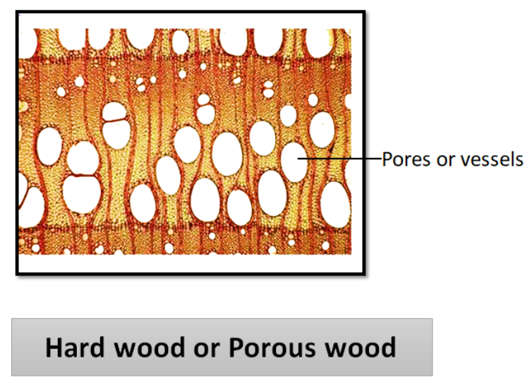 Hint: Porous wood is found in deciduous trees mainly that have a complex structure and possess various vessels. This wood has larger pores that form a band or ring along the earlywood zone.