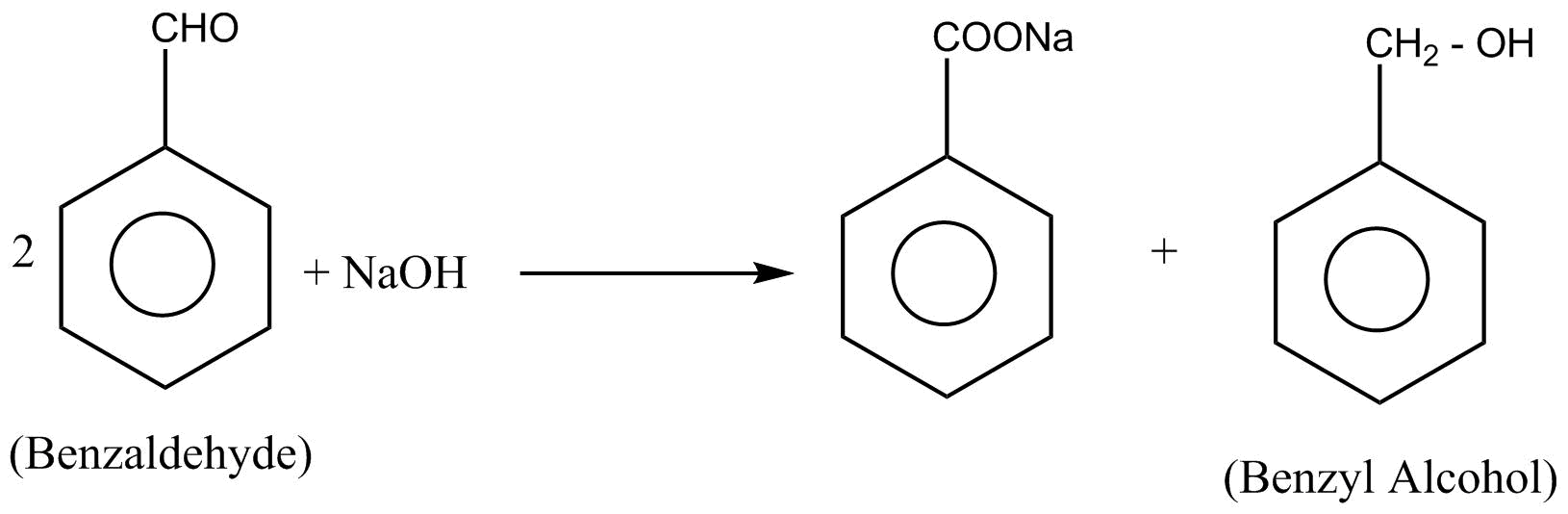 In the Benzaldehyde, $\alpha $-hydrogen is absent. so the $2$ moles of Benzaldehyde undergo cannizzaro reaction to given benzyl alcohol