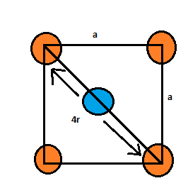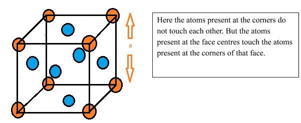 Since the atoms present at the face centers are touching the atoms present at the corners of that face, therefore: