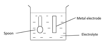 The most commonly used metals for coating are nickel, gold, silver, copper, tin etc. In the process of silver plating, the metal to be plated is coated with silver. In this case, the metal is a steel spoon. The steel spoon to be coated with silver is the cathode of the electrolytic cell. The anode of the electrolytic cell is made of a silver metal and the electrolyte used for electroplating silver on spoon must contain silver ions $ \left( {{\text{A}}{{\text{g}}^{\text{ + }}}} \right) $ , for example, silver nitrate $ \left( {{\text{AgN}}{{\text{O}}_{\text{3}}}} \right) $ or silver cyanide $ \left( {{\text{AgCN}}} \right) $ dissolved in water. When electric current is passed throughout the electrolytic cell, positively charged silver ions $ \left( {{\text{A}}{{\text{g}}^{\text{ + }}}} \right) $ will migrate from the electrolyte towards the negative cathode (which is spoon in this case). Here, the silver ions are neutralized by electrons and they will stick to the spoon as silver metal $ \left( {{\text{Ag}}} \right) $ . On the other hand, the anode bar made of silver metal will give up electrons and form silver ions $ \left( {{\text{A}}{{\text{g}}^{\text{ + }}}} \right) $ .