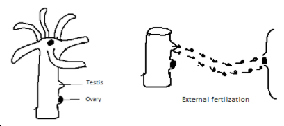 The figure of Hydra shows its reproductive structures and manner of fertilisation.