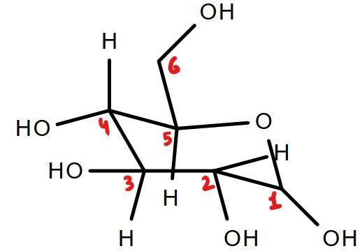 - And in the given structure the beta position is present because the -OH group at first carbon and fifth carbon are attached at the same upper direction as shown below: