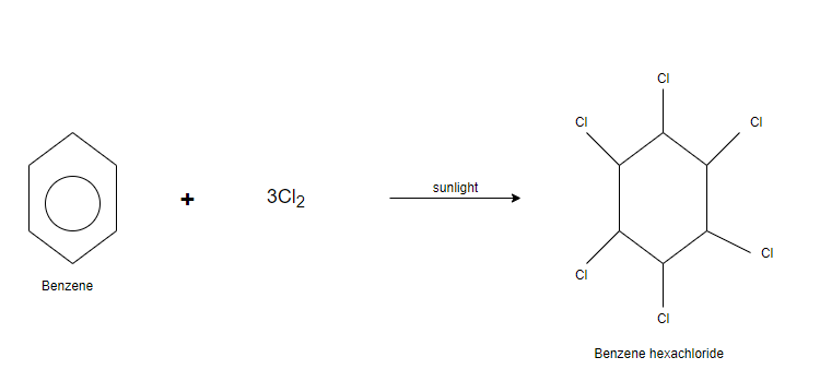Chlorine combines with benzene, in the presence of sunlight and in the absence of oxygen as well as substitution catalysts, to form hexa-chlorocyclo-hexane.