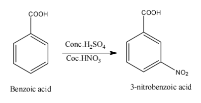 Now, let us write the reaction that takes place when benzoic acid is subjected to a nitration reaction.