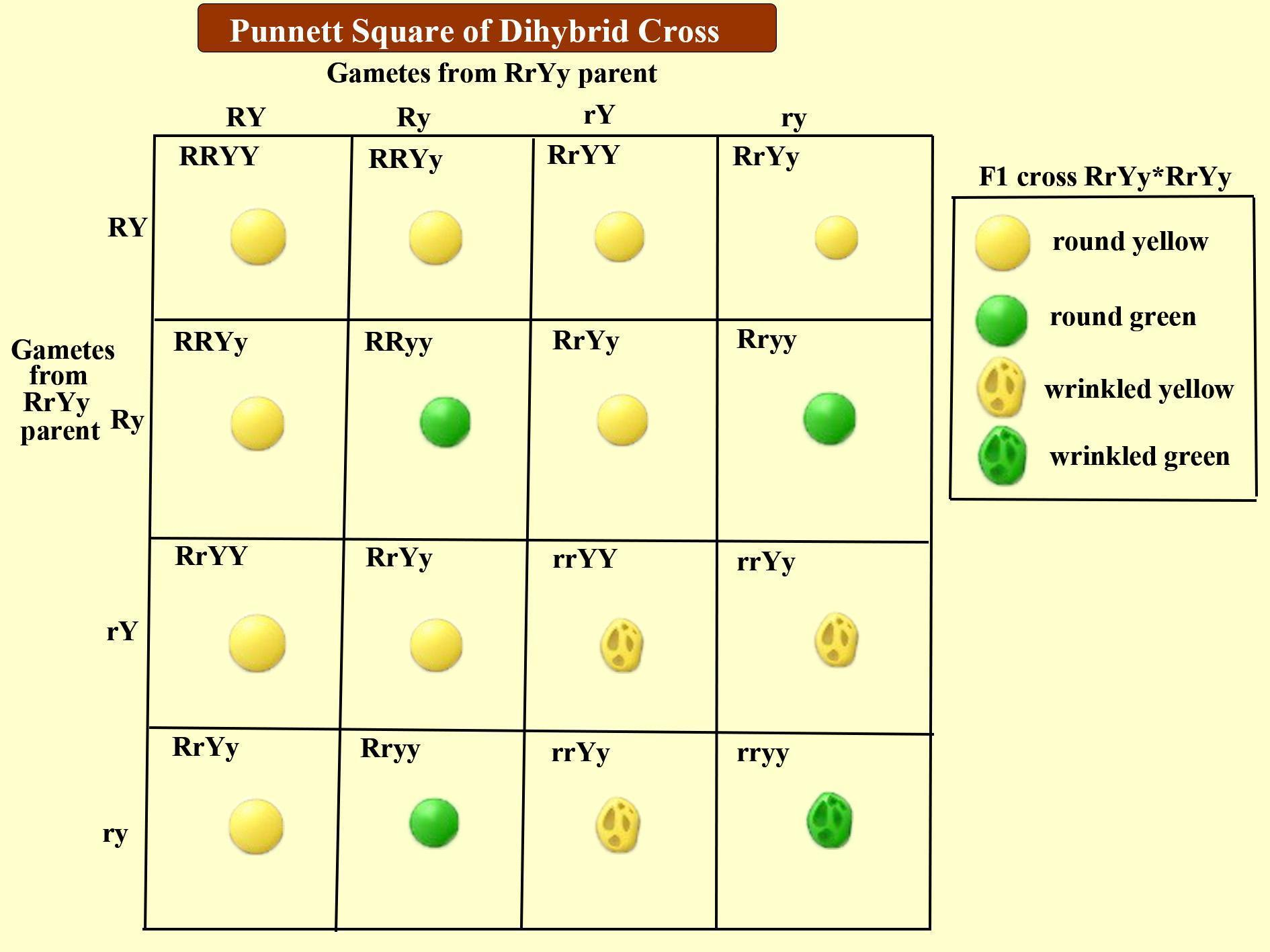 - When round yellow seeds (RRYY) are crossed with wrinkled green seeds (rryy) in filial 1 generation we obtain a progeny of RrYy i.e., round yellow seeds. When F1 progeny undergoes self cross, in F2 generation we obtain a progeny in the ratio of 9 (round, yellow seeds) : 3 (yellow, wrinkled) : 3 (green, round) : 1 (green, wrinkled).
