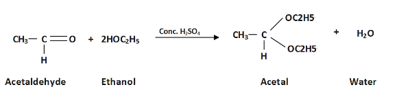 When ethanol reacts with acetaldehyde here ethanol is in excess amount under the presence of sulphuric acid it turns to produce acetal along water. Thus, acetal given by $C{{H}_{3}}CH(O{{C}_{2}}{{H}_{5}})$
