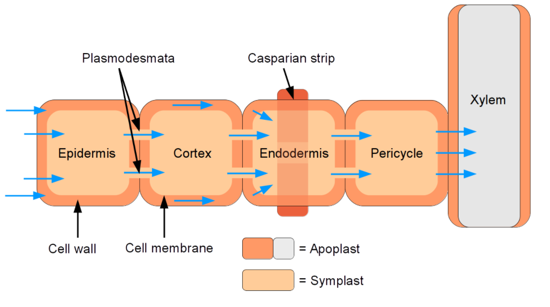 The cytoplasm of the endodermal cell is tightly attached to the Casparian strip so that it does not readily separate from the strip when the cells are subjected to the effects of plasmolytic or other agents normally causing a contraction of protoplasts. The apoplastic system of adjacent cell walls is continuous throughout the plant except at the casparian strips of the endodermis in the root.