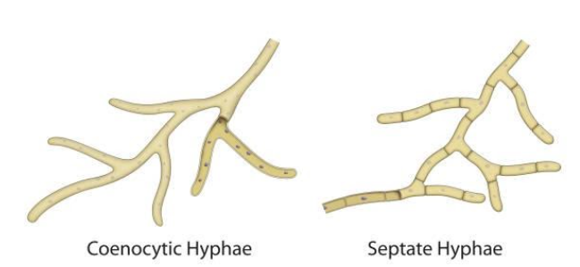 A majority of fungi are filamentous in their form. Meaning, they constitute long thread-like structures that are known as Hyphae. And a collection of hyphae is called Mycelium (Plural-mycelia). These mycelia can either be septate or coenocytic. Look at the diagram below: