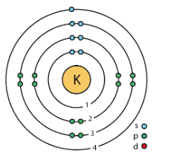We can see that K has 2 electrons in its 1st shell, 8 electrons in its 2nd shell, 8 electrons in its 3rd shell, and 1 electron in its 4th and last shell. s, p, d are the subshells in each shell.