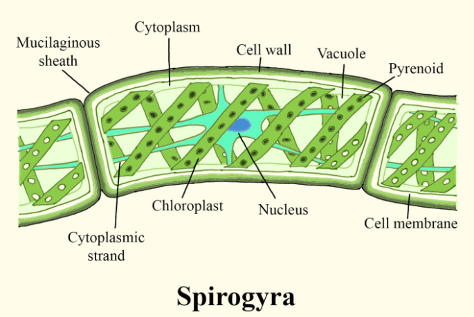 Additional Information: Spirogyra is a filament that is unbranched. The cells are all identical and grouped in a single row. The cells are cylindrical, wide, and long. There are two layers of the cell wall; the outer layer is of pectic material and the cellulose inner layer. Cytoplasm, which covers a large central vacuole, is present inside the cell. In the center of the cell, there is a large single nucleus present. Cytoplasmic strands carry the nucleus. The most feature characteristic of the cell is the spirally arranged ribbon or strap-shaped chloroplasts. The chloroplast count ranges from 1 to 16. There are several chloroplast pyrenoids present.