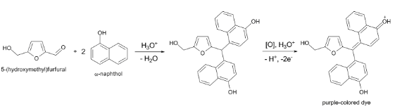 We should remember that this carbohydrate reacts with alpha-naphthol in an acidic medium to form a purple coloured solution. The intensity of colour increases with the increase in the amount of carbohydrate present in the solution. violet coloured ring is formed at the reaction of carbohydrate solution containing Molisch’s reagent and the sulphuric acid