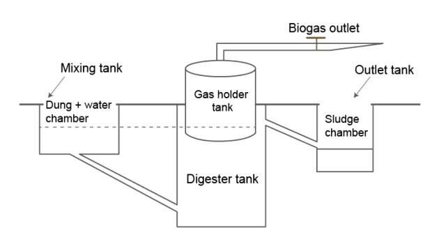 3. Draw a diagrammatic sketch of the biogas plant, and label its various components given below: Gas Holder, Sludge Chamber, Digester, Dung + water chamber.