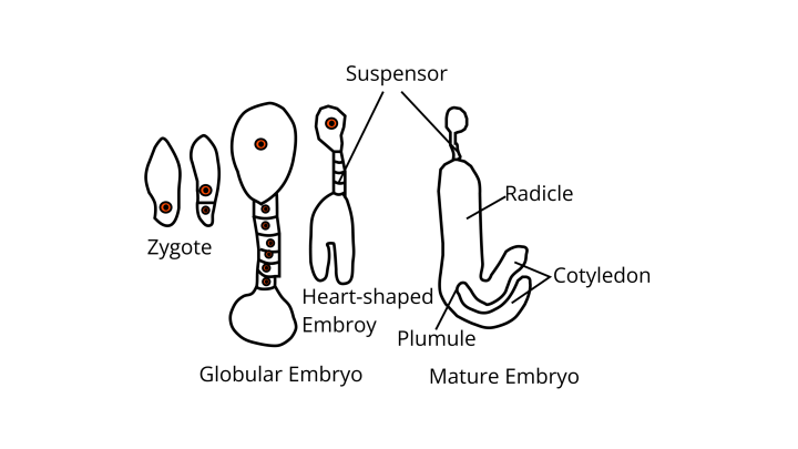 Ans: In a dicot, an embryo goes through the following stages during its course of development:
