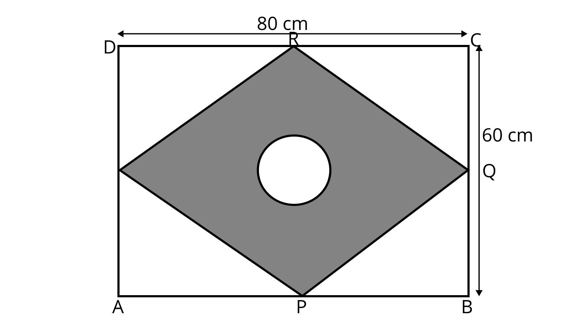 127. ${\mathbf{ABCD}}$ is a given rectangle with length as ${\mathbf{80\;cm}}$ and breadth as ${\mathbf{60\;cm}}{\mathbf{.P,Q,R,S}}$ are the mid points of sides ${\mathbf{AB,BC,CD,DA}}$ respectively. A circular rangoli of radius ${\mathbf{10\;cm}}$ is drawn at the centre as shown in Fig. 9.69. Find the area of the shaded portion.
