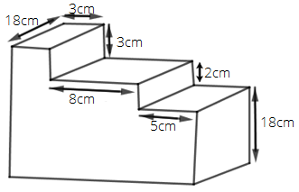 Upper surface area = $\left( {18 \times 3 + 8 \times 18 + 5 \times 18} \right)c{m^2}$