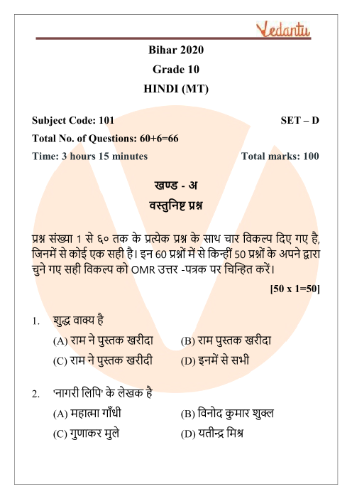FAQs on BSEB Class 10 Hindi Question Paper 2020