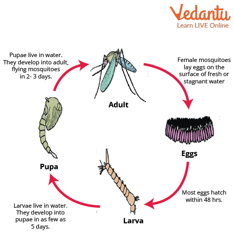 The fourth stage is the adult stage. Adult female mosquitoes bite people and animals as they need blood to produce eggs. After feeding on blood, female mosquitoes lay eggs in water. It takes several days to feed and look for a place to lay eggs. They bite human beings only when other animals are not present near them. Since Culex bites animals and people, they live outdoors or near homes, dirty water, garbage areas, and dirty places.