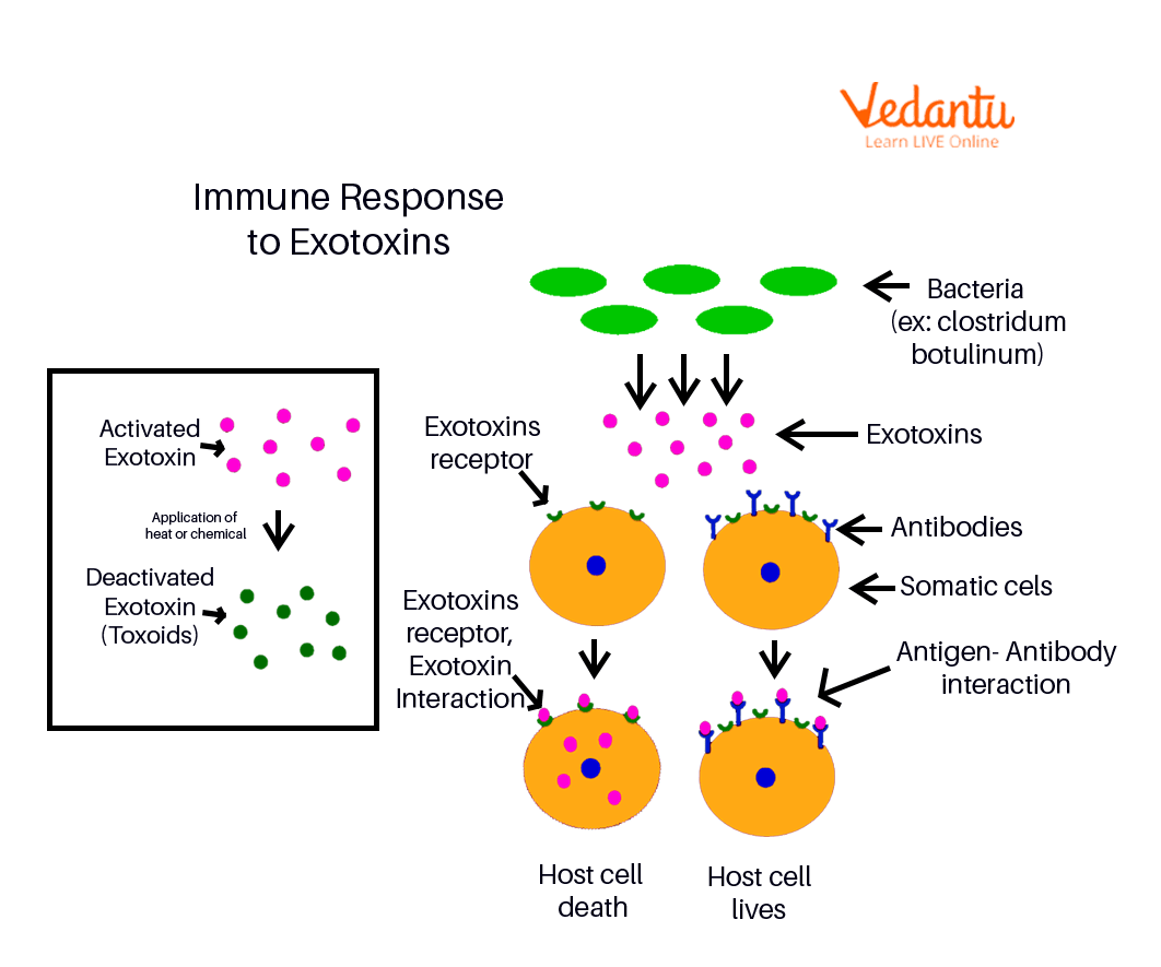 This figure shows that exotoxins are discharged by bacterial cells, Clostridium botulinum for instance, and are harmful to substantial cells. Substantial cells have antibodies on the cell wall to target exotoxins and tie to them, forestalling the intrusion of physical cells. The limiting of the exotoxin and immuniser structures an antigen-counter acting agent association and the exotoxins are focused on for obliteration by the resistant framework. If this cooperation doesn't occur, the exotoxins tied to the exotoxin receptors that are on the cell surface cause the demise of the host cell by hindering protein amalgamation. This figure additionally demonstrates the way that the utilisation of intensity or synthetic substances to exotoxins can bring about the deactivation of exotoxins. The deactivated exotoxins are called pathogens and they are not harmful to physical cells.