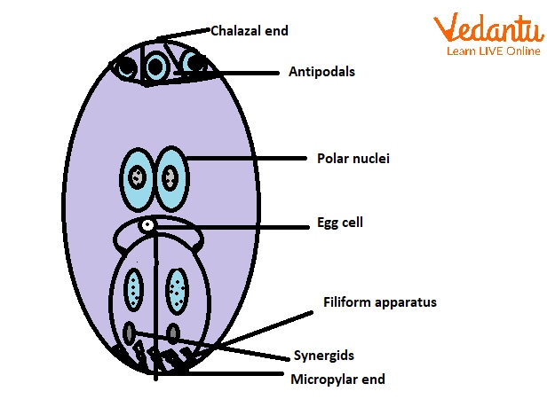 The egg apparatus is present towards the micropylar end and contains the egg cell, which forms a zygote after fusion with the pollen during fertilisation. The pollen tubes are reported to grow towards the egg apparatus because the synergid cells are thought to secrete a chemical that attracts the growth of the same, or we can say that pollen tubes progress chemo tropically in the ovule. The tip of the pollen tube bursts after entering the embryo sac. As a result, the male gametes are released.