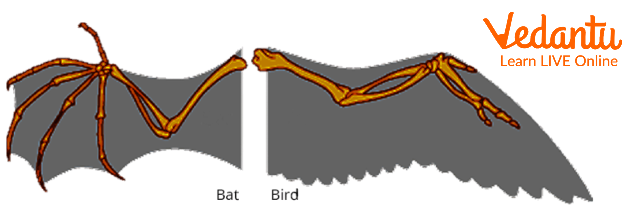 Homologous structures are organs or bones that appear in different animals, showing anatomical similarities from a common ancestor, but may perform different functions. For example, the forelimbs of a human, a bat, and a whale are homologous. In contrast, analogous structures have similar functions but do not share a common ancestral origin; they evolved independently. For example, the wings of a bird and the wings of an insect are analogous.