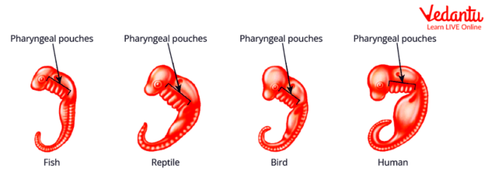 The science of the development of embryos from fertilisation to birth is called embryology. All vertebrate embryos exhibit pharyngeal pouches at a certain stage of their development. These features, which develop into neck and face parts, suggest relatedness of different organisms with each other. Patterns of embryological development can indicate a common ancestry. Fish, birds, mammals and reptiles all have gills; only fish retain theirs and fish, birds, humans and reptiles all have tails; but humans retain theirs.