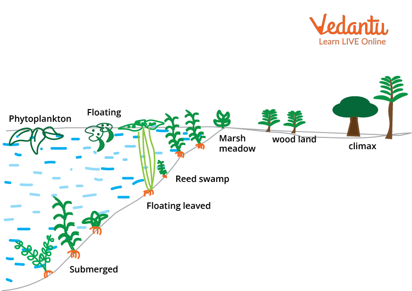 Succession is a unidirectional series of changes that brings about a change in community composition. As the succession progresses, it leads to the formation of a stable climax community. The transient stages in the progressive successional series are called the seral stages. Hydrarch succession is a primary type of succession which starts in aquatic environments like ponds and lakes.