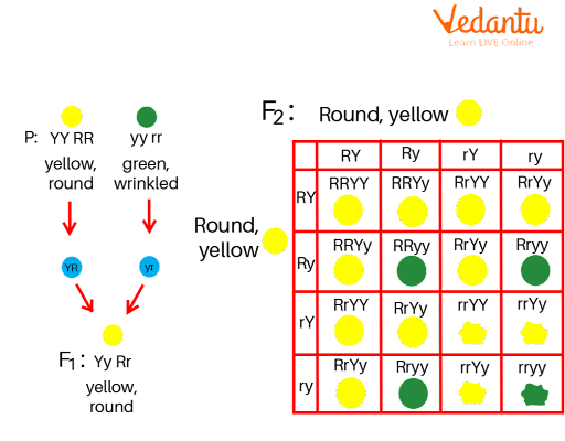 Then he again crossed two plants of the first filial generation and obtained the second filial generation. 56% of plants were round and yellow. 18% of plants were yellow and wrinkled, and 18% of plants were green and round whereas 6% of plants were round and wrinkled.