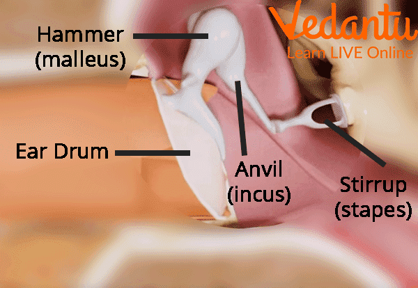 The eardrum is a membrane similar to a drum head located between the outer and inner ear. When sounds reach in tympanic tissue, it vibrates and causes the tiny bones to move. Next, the tiny bone called the hammer, incus, and stapes start moving and raise the vibration transmitted by the ear drum, then the bones send the amplified signal to the cochlea.