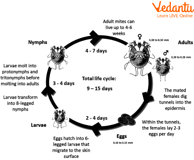 These mites take around 3-4 days to hatch. After hatching these mites move to the outer surface of the skin where these mites mature into adults.