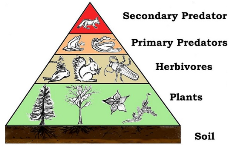 | 3. Secondary Consumers | Eat primary consumers | Frog, small bird |