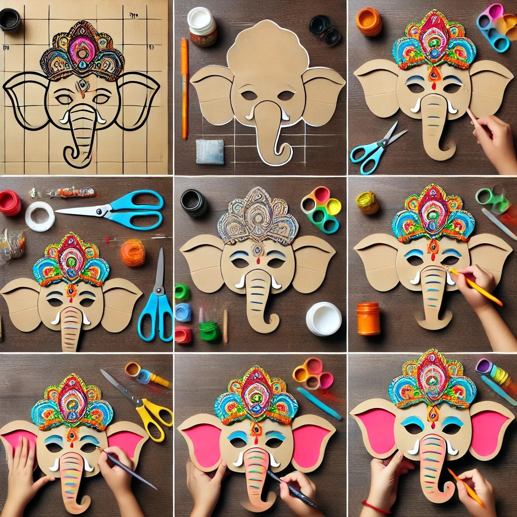 Use recycled cardboard, colours, and elastic bands to create Ganesha masks. These can be painted and decorated, then worn during class presentations or cultural assemblies.