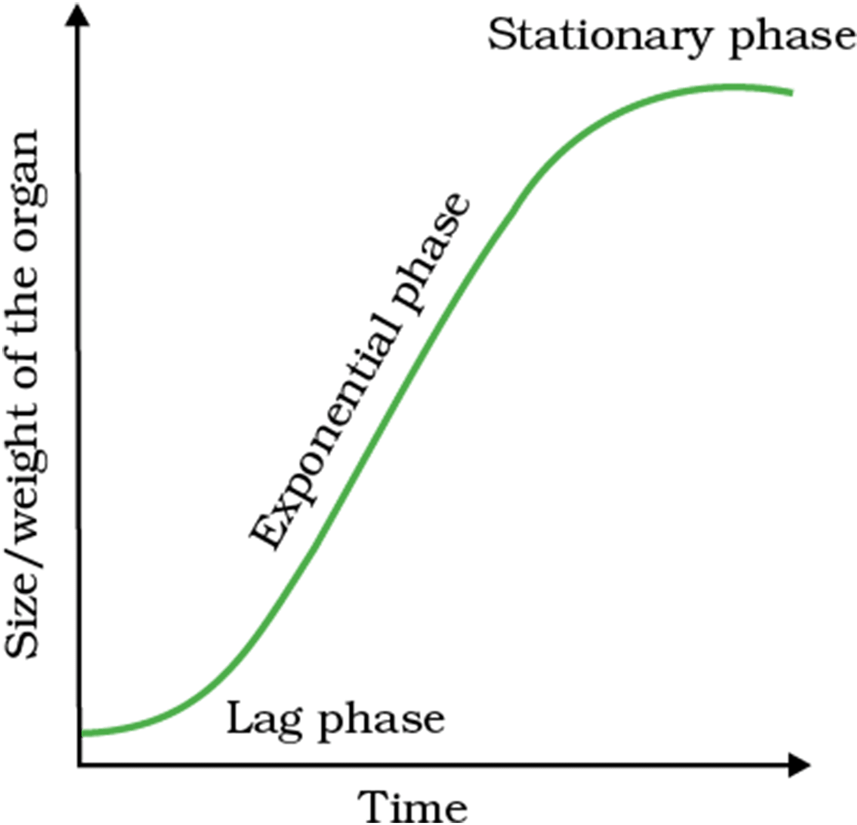 The sigmoid growth curve represents three key stages: lag (slow initial growth), log/exponential (rapid growth), and stationary phase (growth rate plateaus). This S-shaped graph models plant growth realistically, providing a standard pattern referred to in CBSE Class 11 important questions.